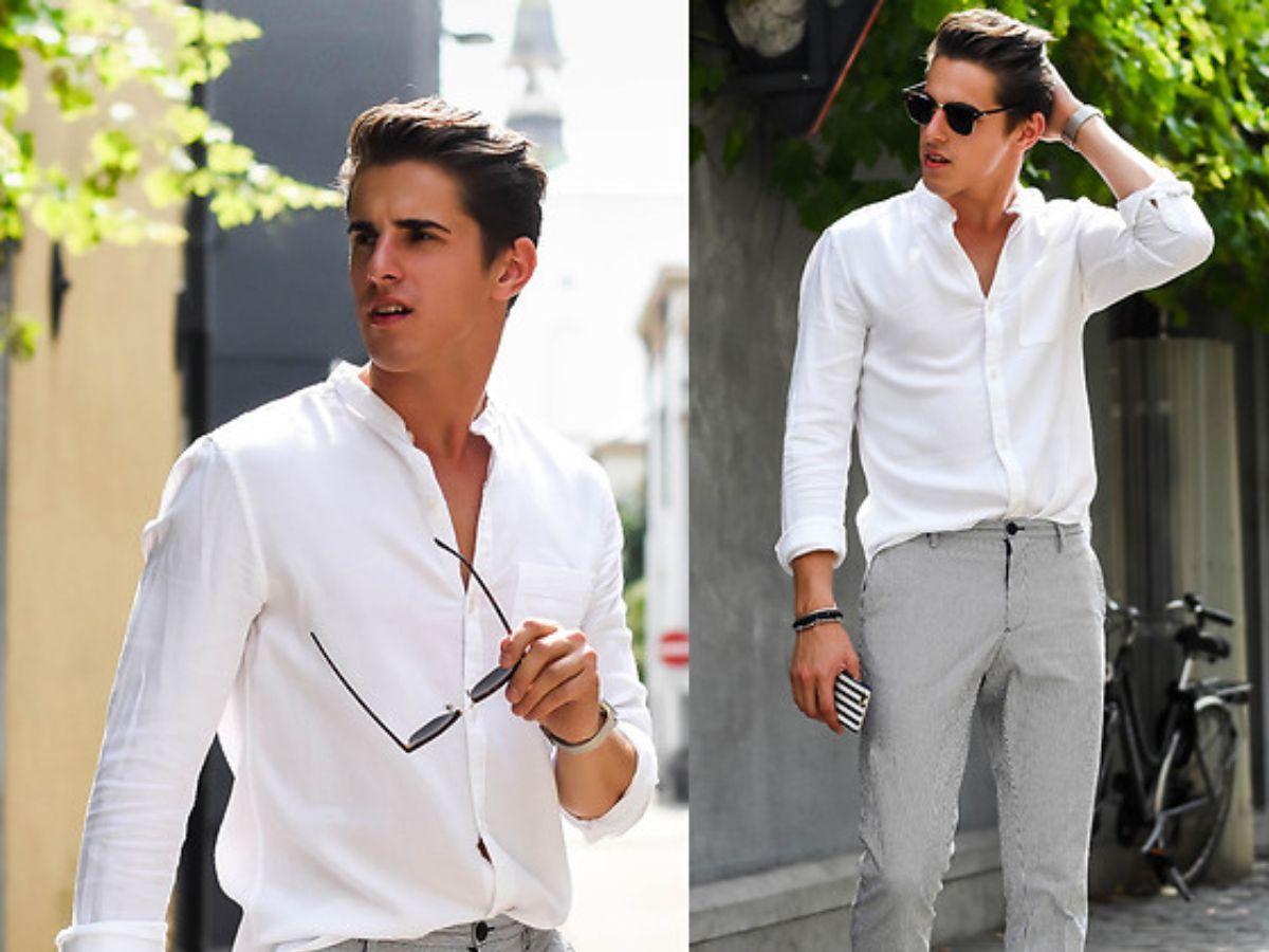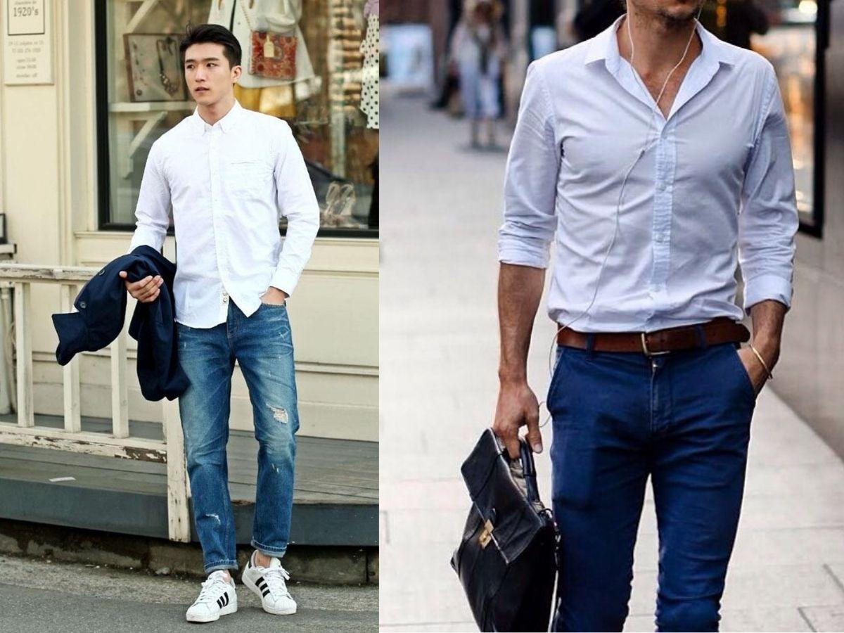 Khi bạn muốn diện một bộ trang phục đơn giản nhưng đủ lịch thiệp, bạn cần lựa chọn áo sơ mi trắng. Cùng với đó là sự kết hợp cùng quần âu hoặc khaki. Hãy kết hợp thêm một số phụ kiện như thắt lưng hay đồng hồ, kính râm và một đôi giày tây/slip on ăn nhập.