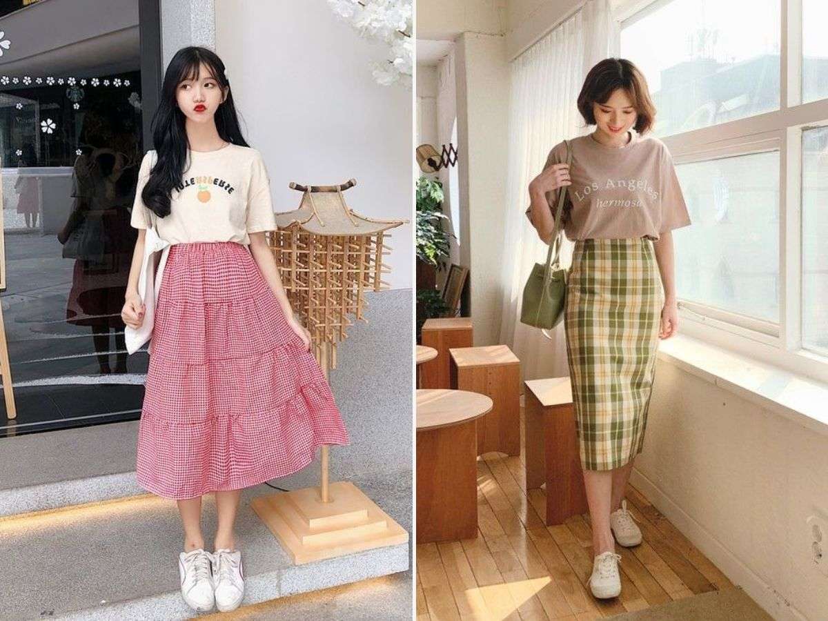 Phong cách thoải mái, phóng khoáng và đậm chất street style chính là đây! Phối chân váy caro (đặc biệt là dáng ngắn hoặc chữ A) với áo thun oversized tạo nên sự tương phản thú vị. Set đồ này cực kỳ hợp cho những ngày bạn muốn F5 phong cách, trở nên năng động và tự do hơn.