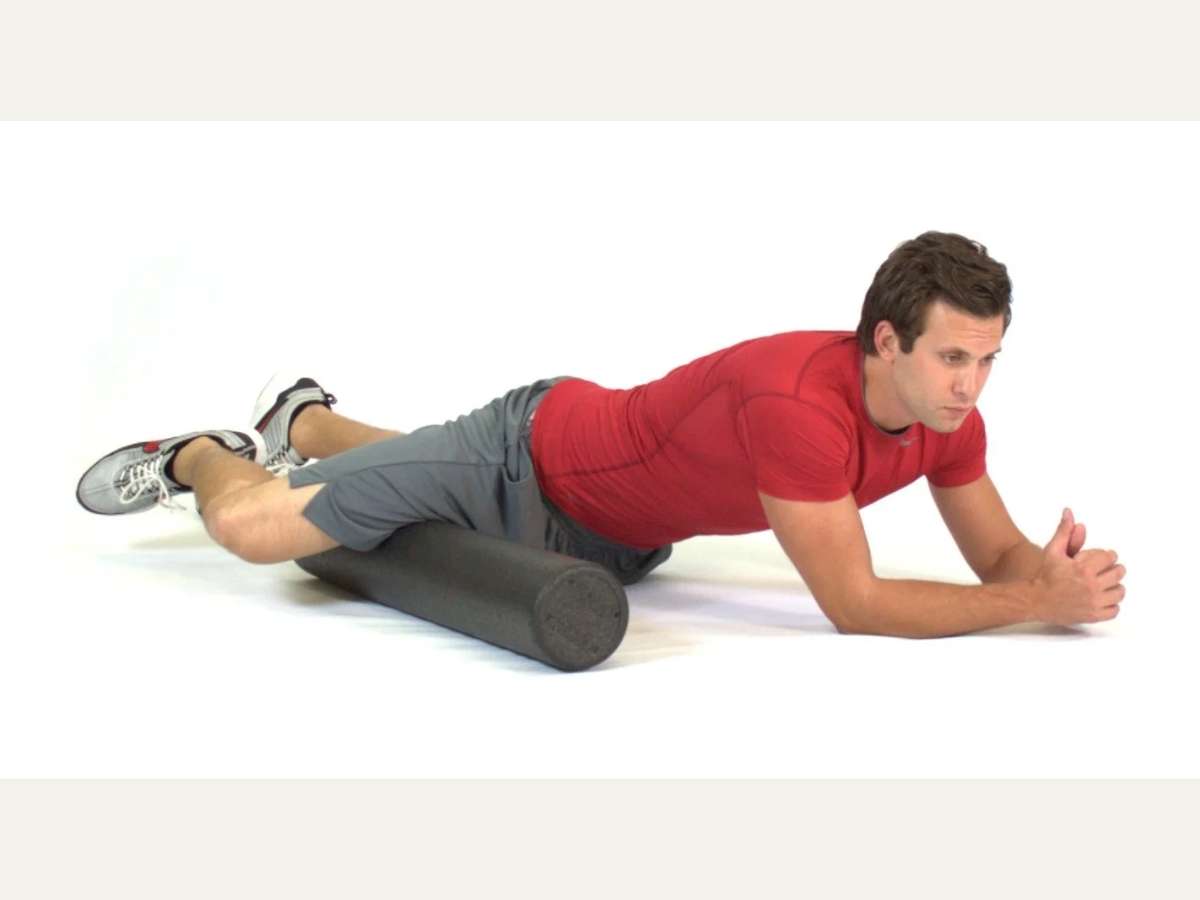 • Nằm sấp, đặt foam roller dưới đùi trước.