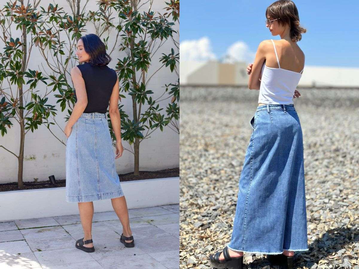 Chân váy jean midi/dài: Mang đến sự kín đáo, thanh lịch và sang trọng, phù hợp với nhiều loại hình tiệc, kể cả những sự kiện trang trọng hơn.